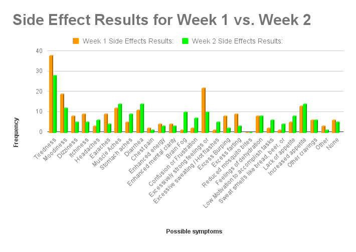 We experienced more occurrences of side effects during the first week vs. the second week. With the exceptions of muscle aches, diarrhea, and increased appetite on the days off the cleanse, everything else trended downward.