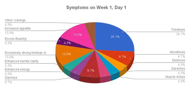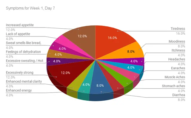 After day four - when we took a break from the 100% Gum Spirits of Turpentine protocol - our symptoms decreased dramatically, and some community members went back to zero symptoms! You will see in later results how they felt even better after most of the detoxing side effects wore off. Many of us also experienced beneficial symptoms while detoxing; such as an increase in mental clarity and mental energy!