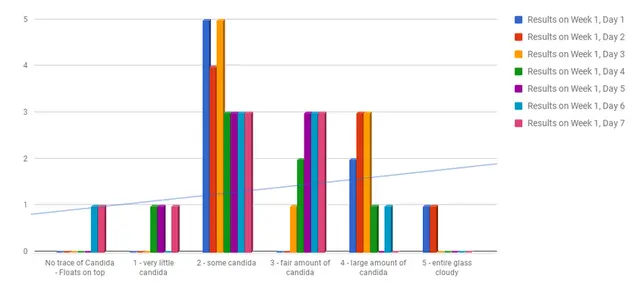 The chart doesn't show the amount of candida by person. However, you can see the definite trend from day one to day seven. We started out with a few people having very large amounts of candida in their spit test. One of those individuals has gone from the entire glass being cloudy down to no trace of candida or very little candida on all her tests. Even the people that are still hovering in the middle range are trending downward!