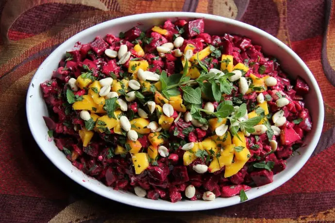 2. Mix beets, jicama, mango, feta, salt, pepper, and garlic powder, and toss with dressing.