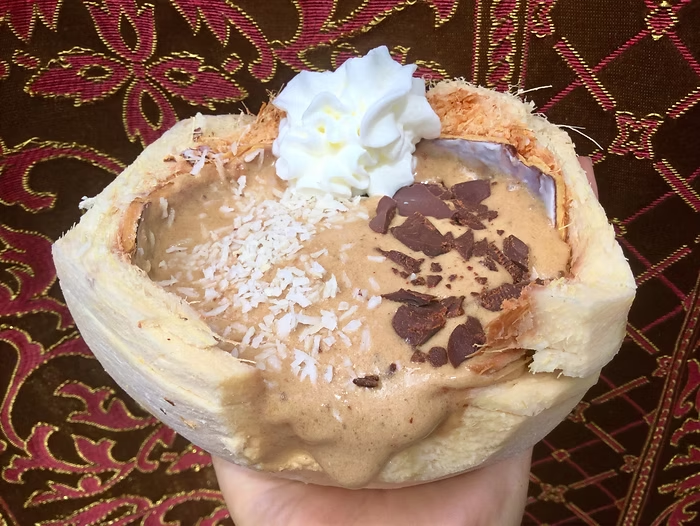 - Garnishes (optional): coconut bowl, shredded coconut, grated dark chocolate, slivered almonds, banana slices, spiced date spread, fresh fruit, whipped cream (dairy or non-dairy)
