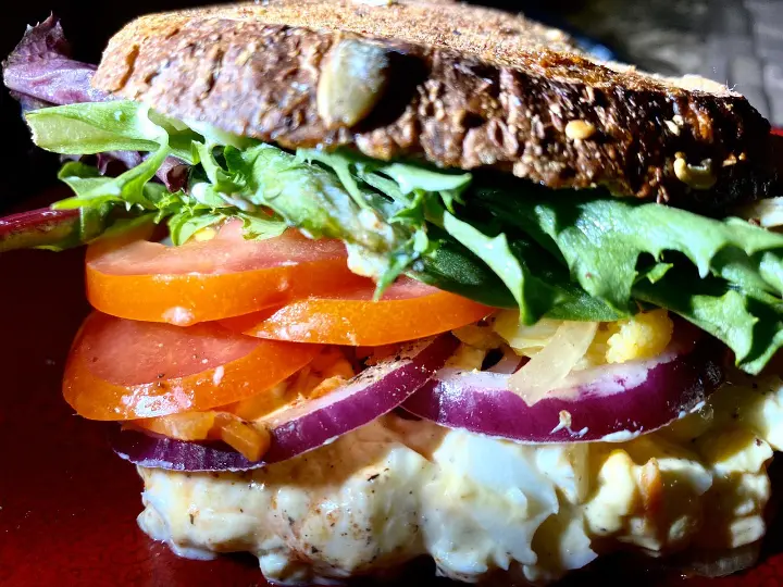 4. Spread egg salad on one slice of bread, sprinkle with Everything Bagel Seasoning, and top with red onion, tomato, lettuce, and the other slice of bread.