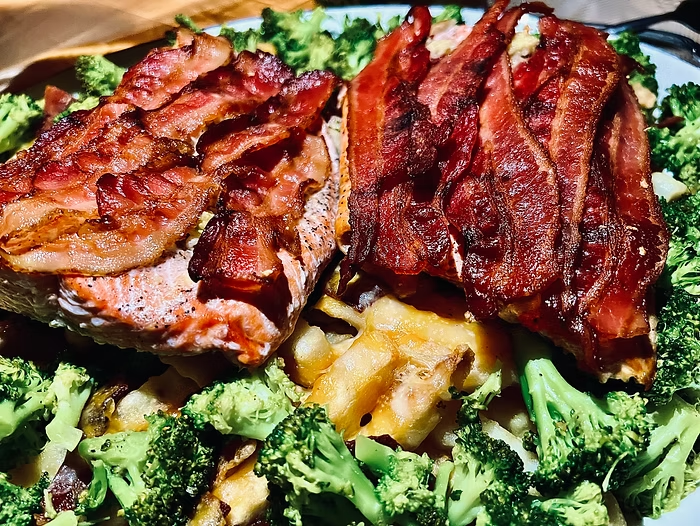 - Flip salmon, and lay strips of bacon on top. Cook for 5-10 more minutes.